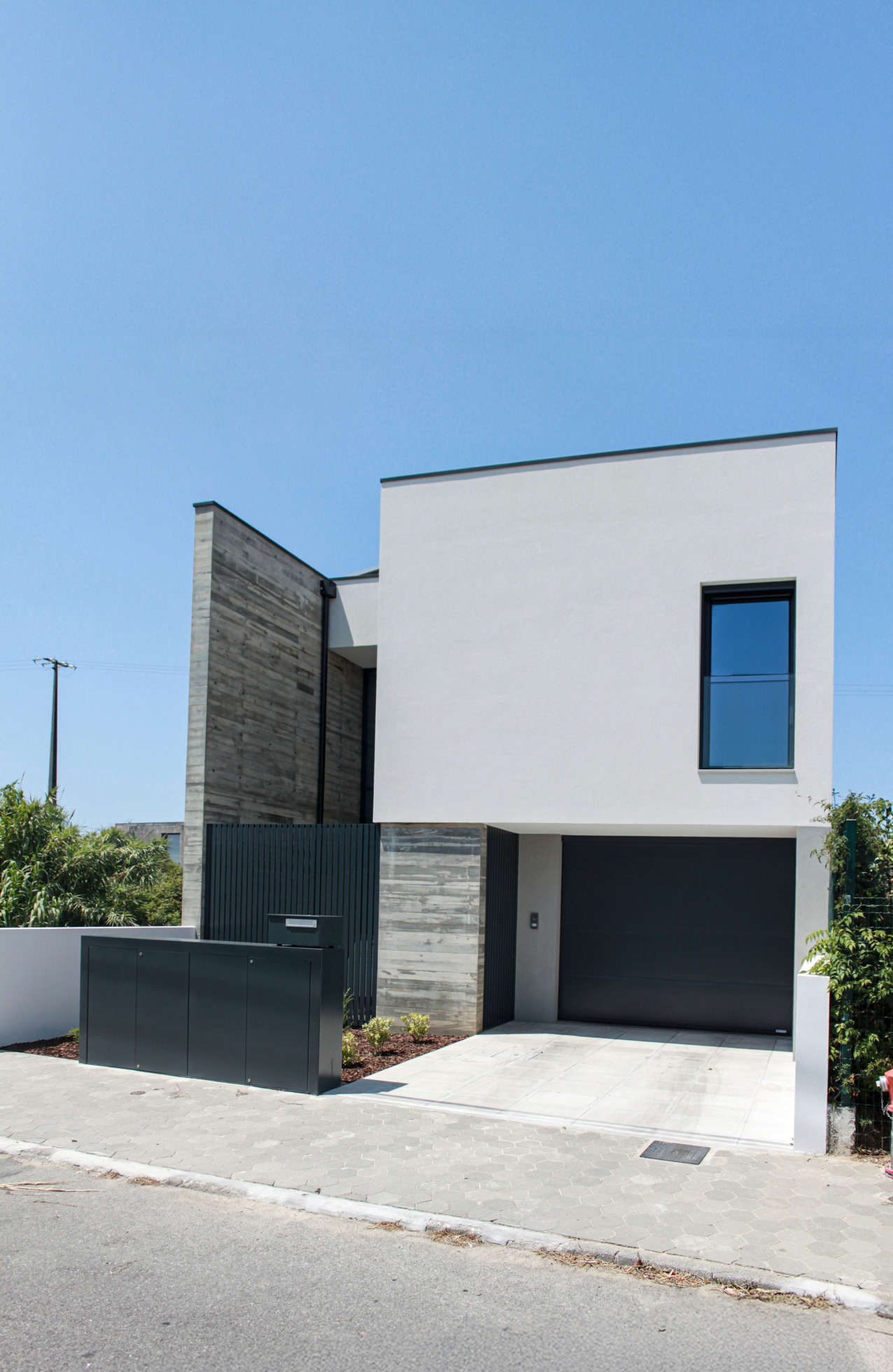 O volume proposto constitui-se pela simplicidade e reduzida presença de fenestrações sobre a via pública. É composto por dois pisos mais sótão.