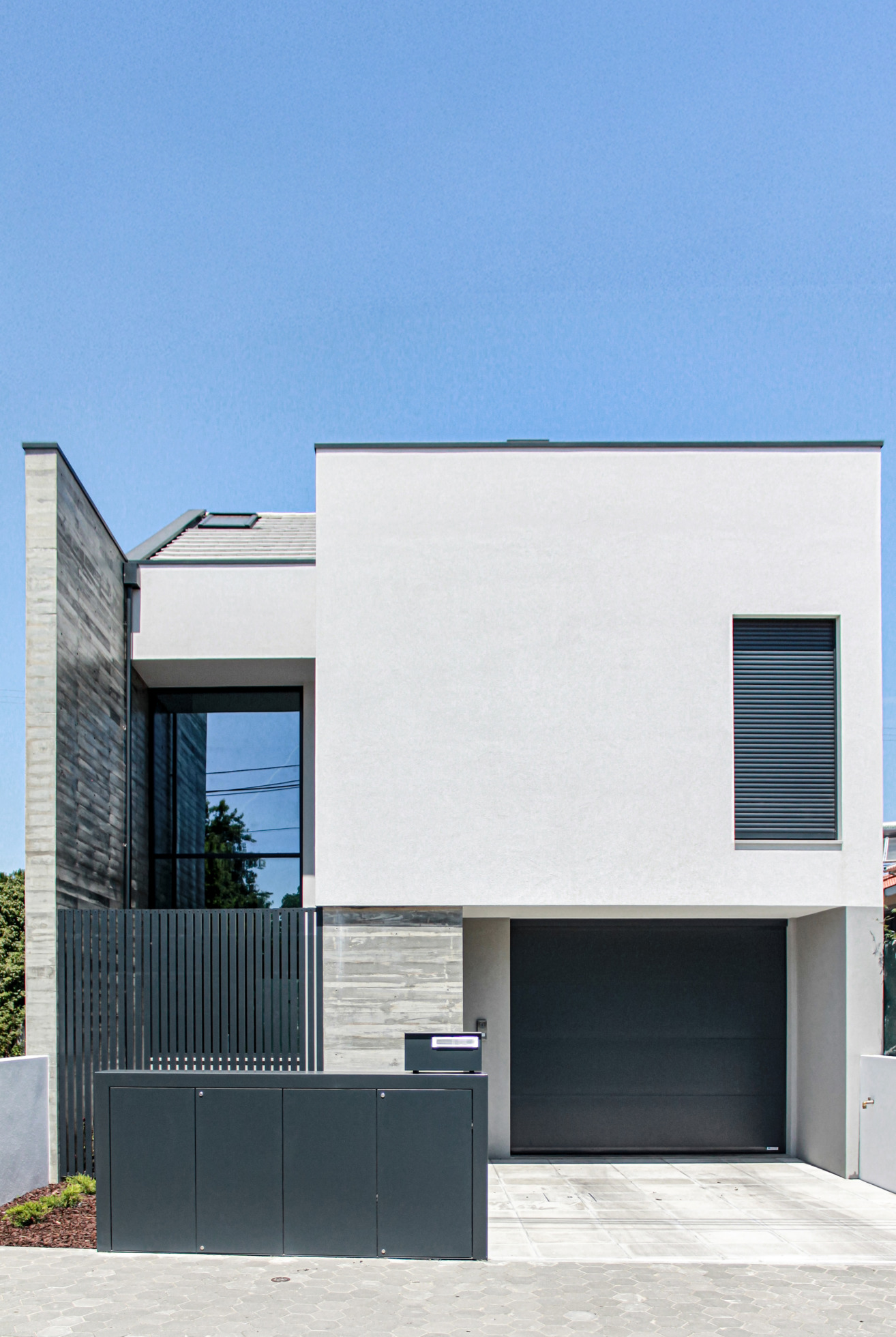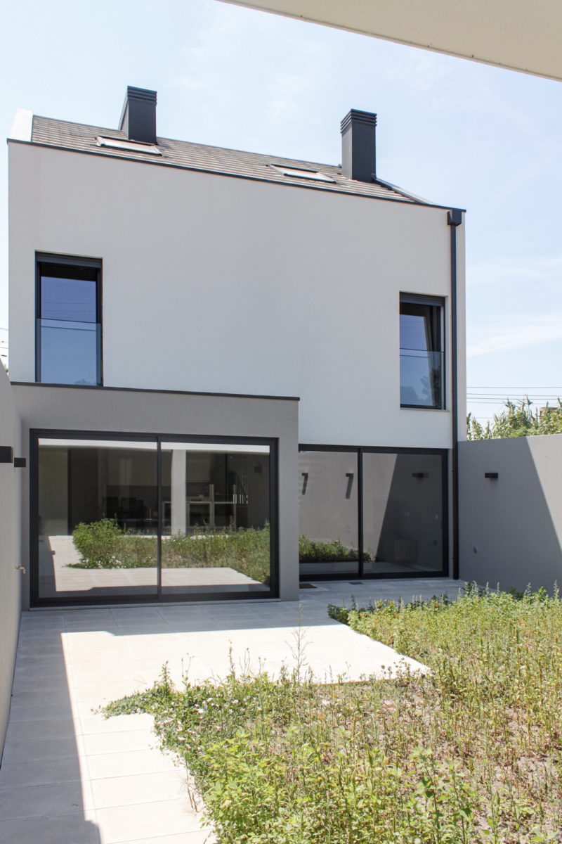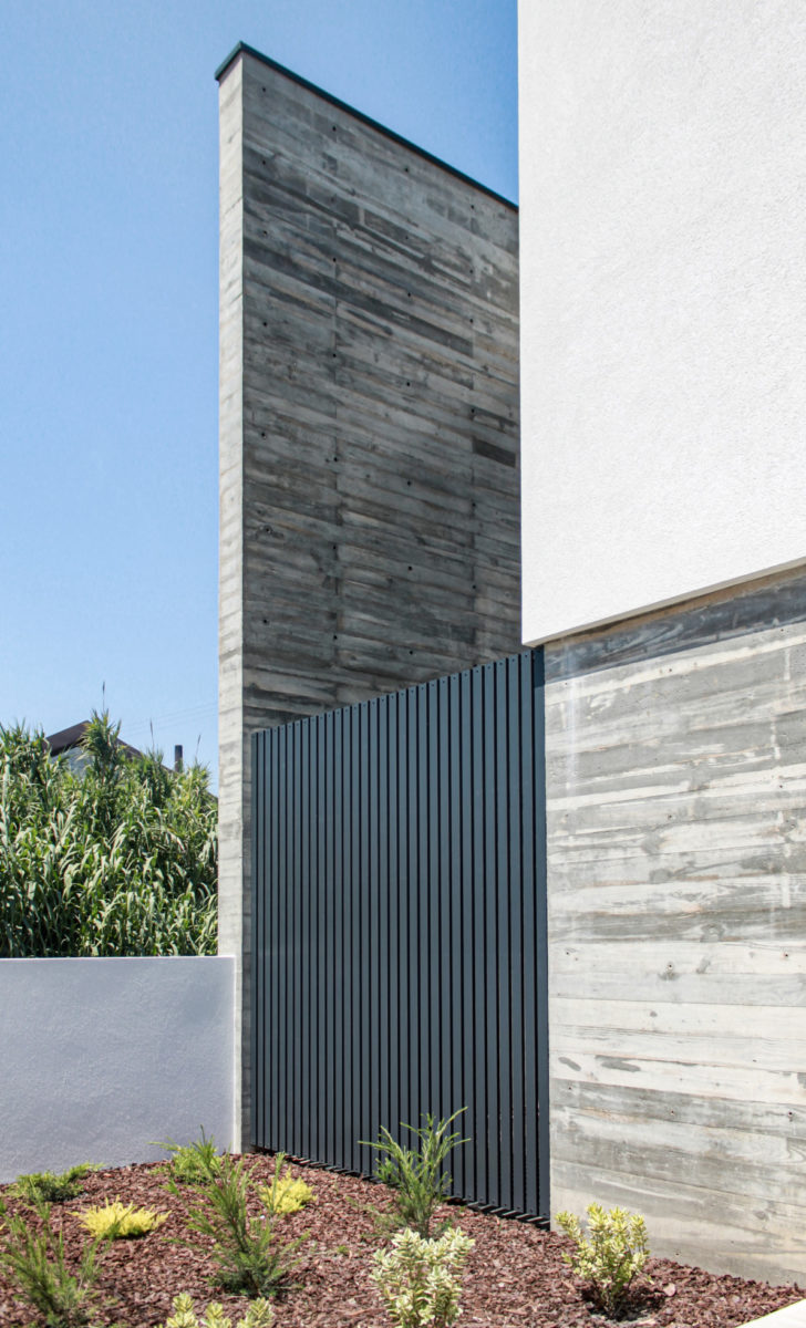 As condicionantes especificavam a implantação permitida bem como a área bruta obrigatória. A orientação solar sul – sobre a via pública – sugeriu a procura de esvaziar o interior, abrindo caminho à penetração de luz solar natural para o interior da moradia, de um modo que não comprometesse a privacidade necessária. A resposta encontrada consiste na subtracção da volumetria de implantação do lado sul, tanto exterior como interior, constituindo-se assim a identidade desta moradia.