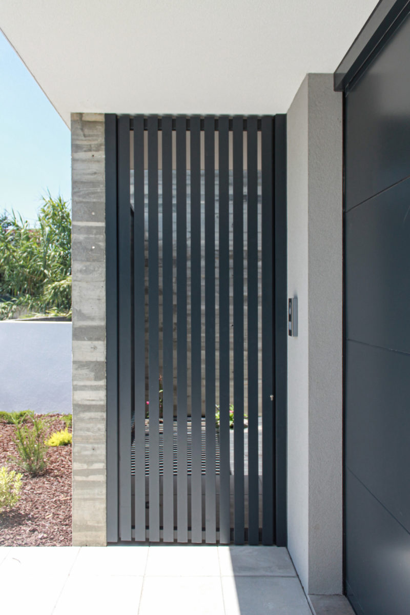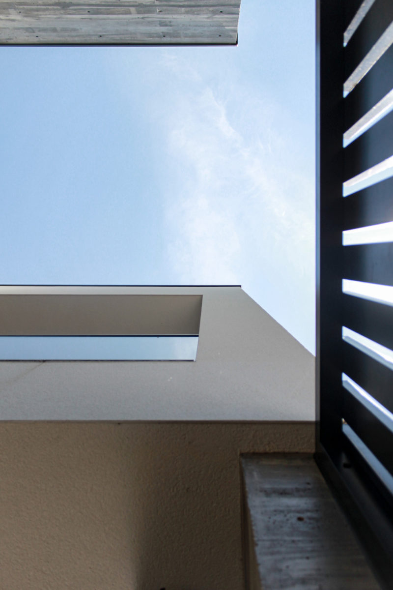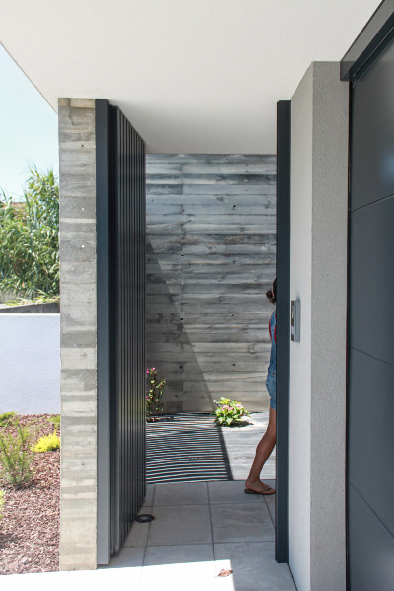 Em diálogo directo com este pátio de entrada, um espaço estruturante de entrada e circulação – o hall de pé direito total – promove a ligação entre os pisos e constitui-se como espaço de articulação de cotas, vivências e diversos graus de privacidade interior e exterior.