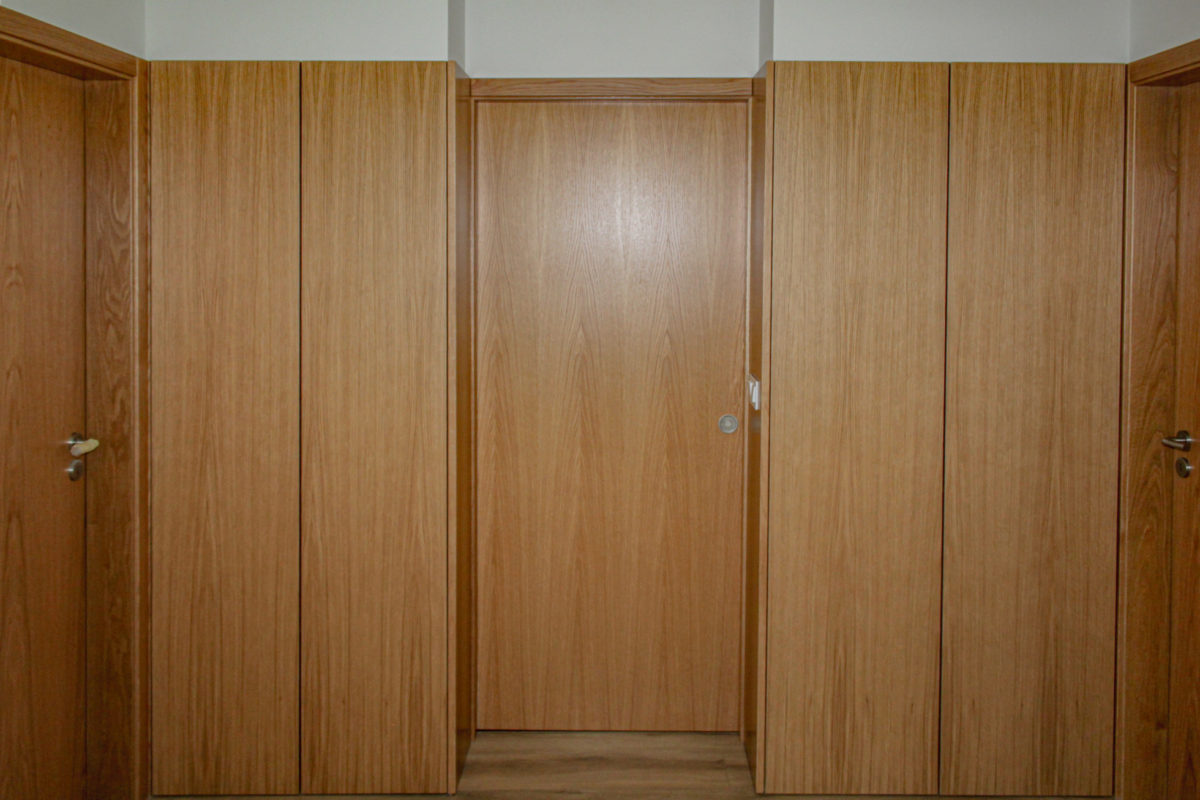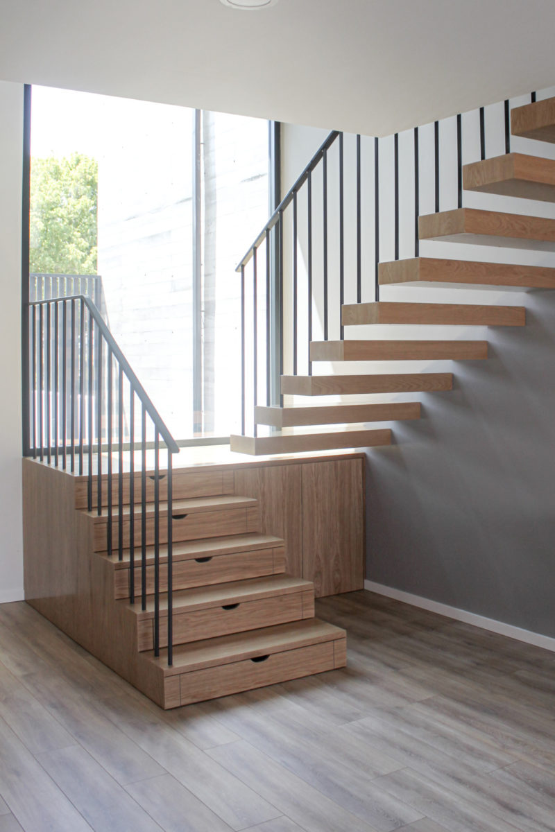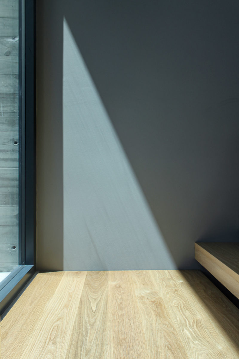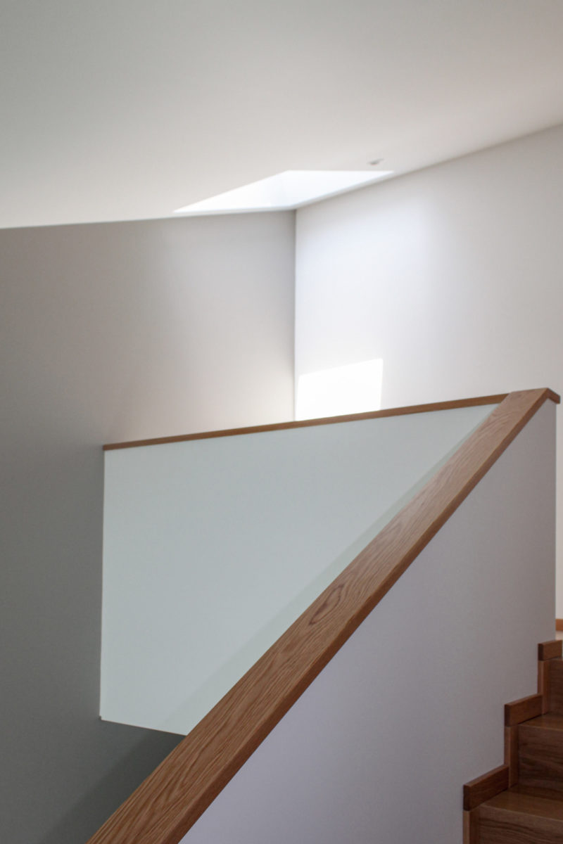 Em diálogo directo com este pátio de entrada, um espaço estruturante de entrada e circulação – o hall de pé direito total – promove a ligação entre os pisos e constitui-se como espaço de articulação de cotas, vivências e diversos graus de privacidade interior e exterior.