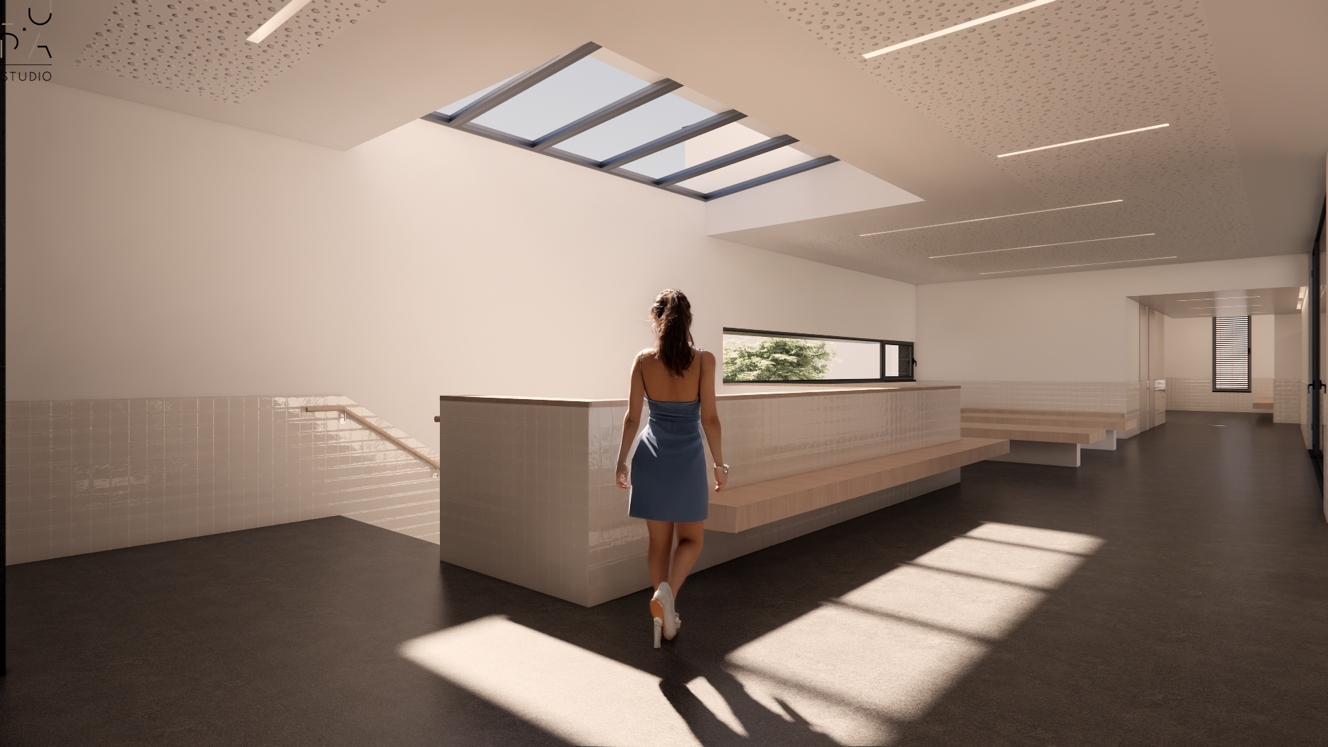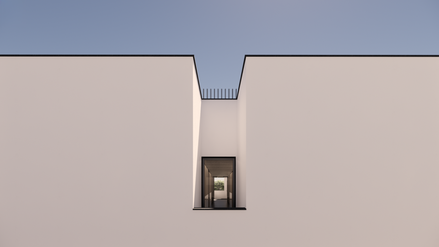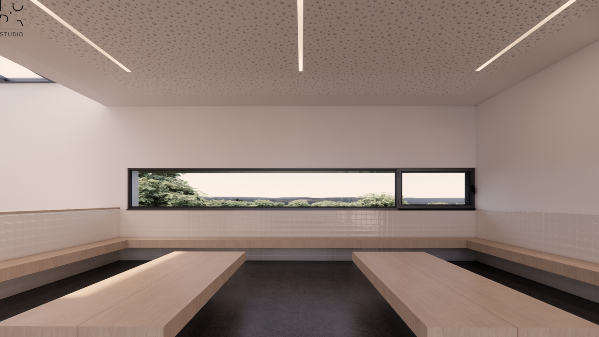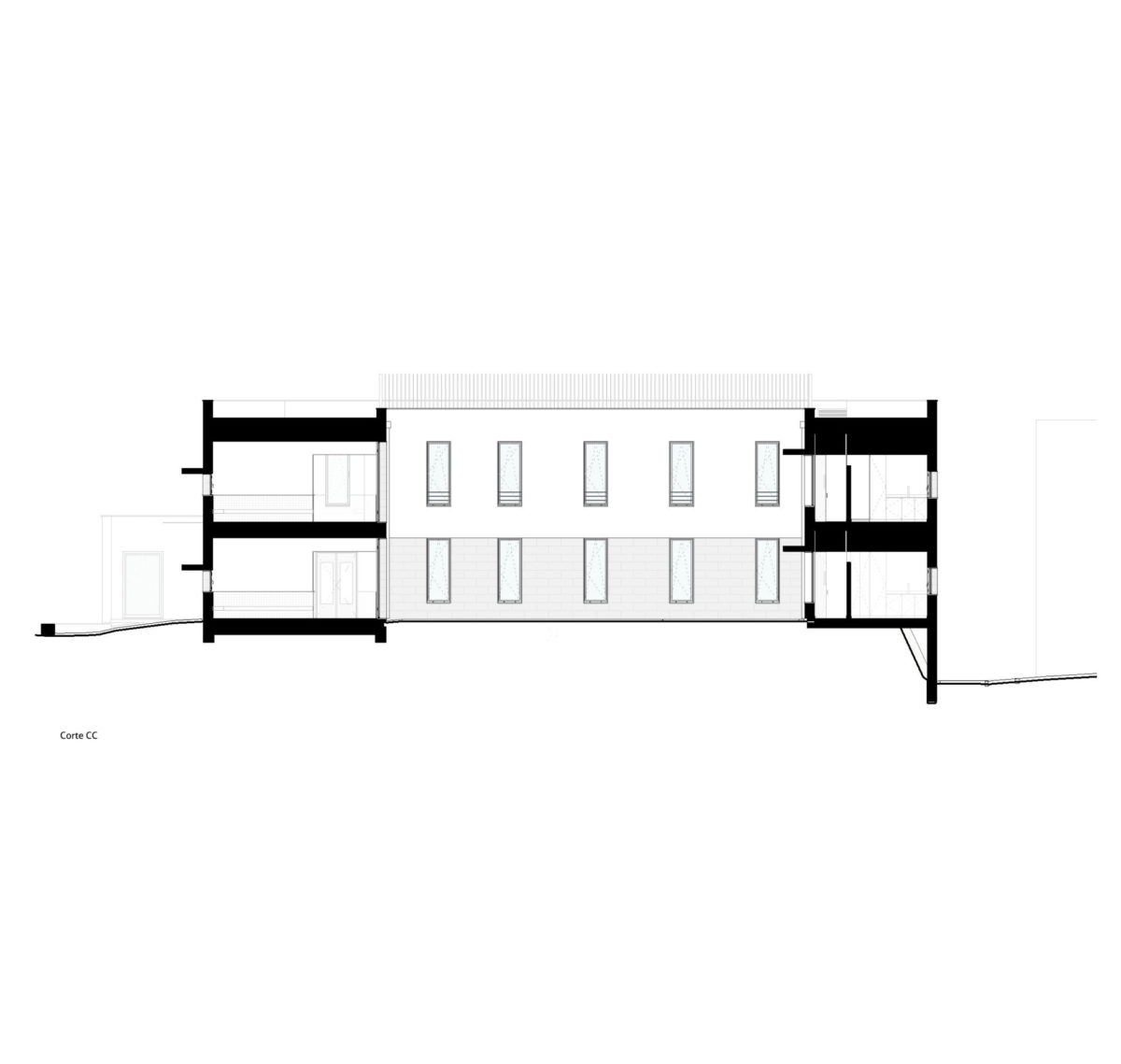 Em complemento é criada uma pequena área em cave, aproveitando o declive natural, dedicada à entrada de pessoal com vestiários e áreas técnicas.