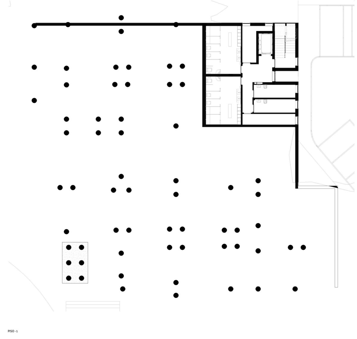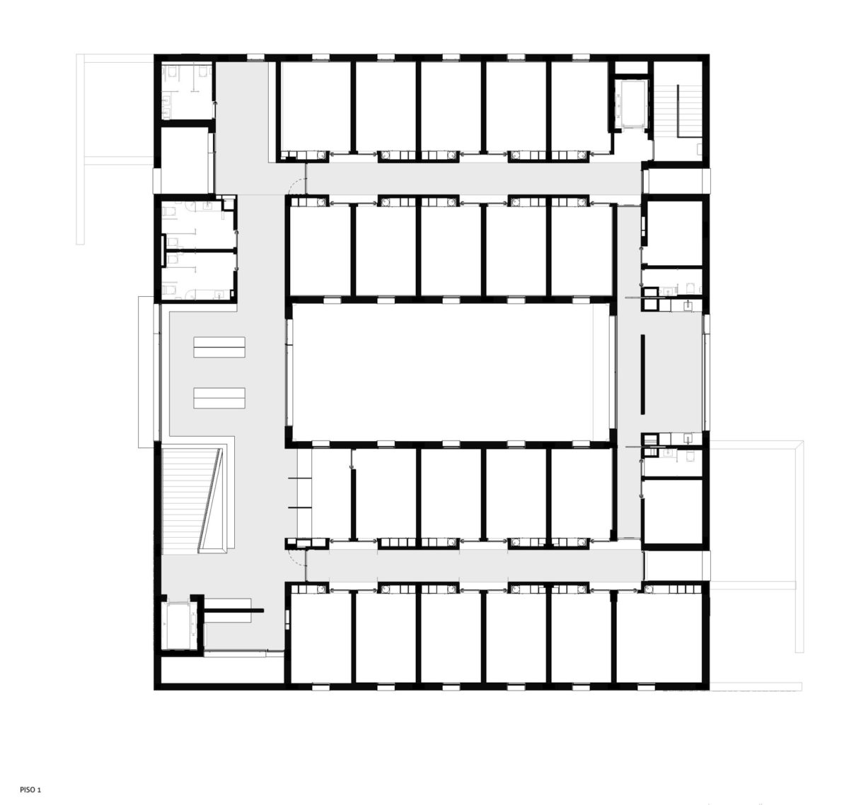 No canto noroeste do edifício localiza-se a entrada de pessoal que dará acesso à circulação vertical de escadas e elevador dedicadas aos profissionais permitindo a separação clara de circuitos. A área em cave será ocupada pelos vestiários / balneários dos profissionais e algumas áreas técnicas e de resíduos.